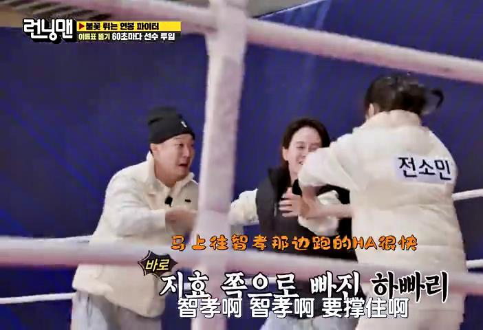 如果是一对一,宋智孝可以很轻松打败全昭旻。可惜的是宋智孝登场的时候犯了一个很低级的错误,她居然背对着他们钻上了拳台,这就使得她刚一站到台上就陷入了哈哈和全昭旻的两面夹击中。