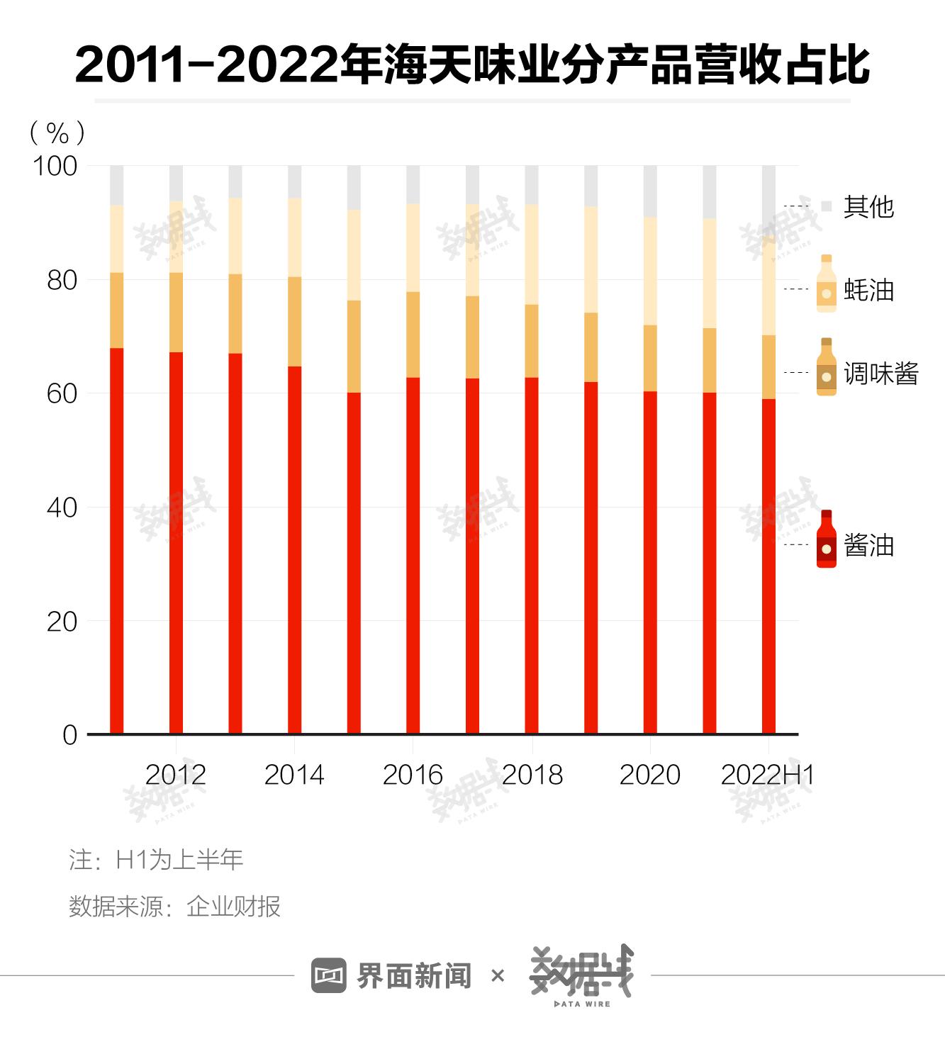 海天味业赚钱主要靠卖酱油。2011年至2021年,海天味业主营业务收入中,酱油产品收入连续11年占比超6成。同期,另外两大产品调味酱和蚝油收入占比合计约3成。今年上半年,酱油产品收入占比跌至59.1%,依然高于其他产品。