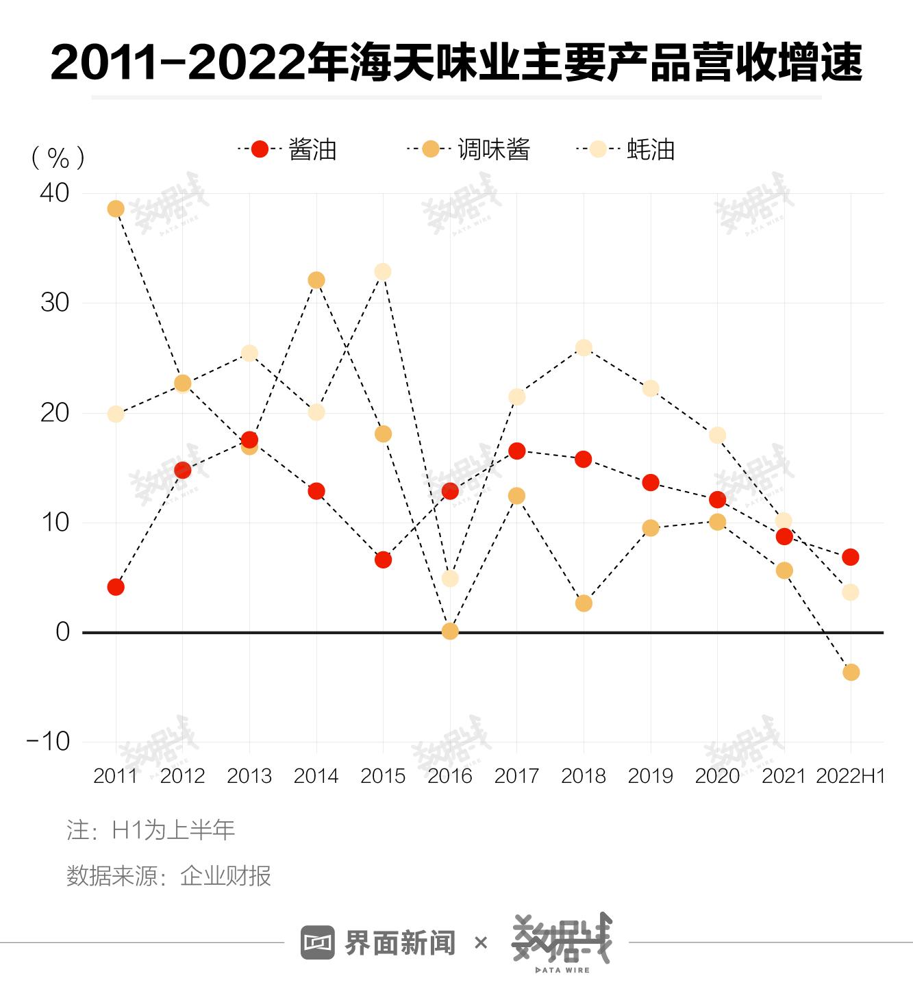 海天味业3类主要产品营收遇上了瓶颈期。截至2021年,海天味业酱油营收增速连续4年下降,蚝油营收增速连续3年下降,调味酱营收增速也低于2020年同期。到2022年上半年,调味酱产品营收出现下跌,酱油和蚝油营收增速也都降至个位数。