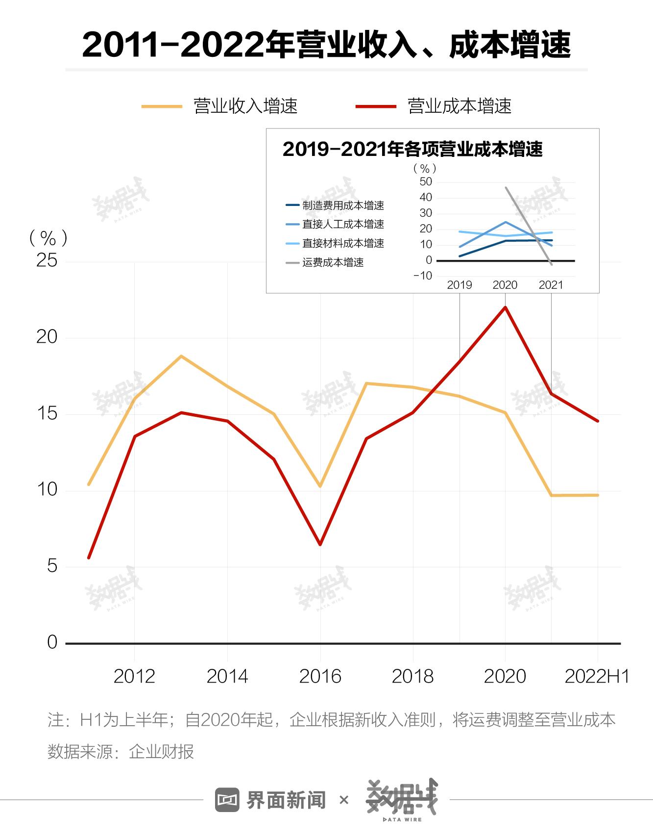 自2019年起,海天味业的成本一直比收入涨得快。其中,直接材料成本增速连续3年超15%。据海天味业2022年半年报,原本已经高企的成本今年继续超预期上涨,产品盈利能力被压缩,公司经营压力进一步加大。此外,2020年,海天味业的直接人工成本、运费成本增长较快,据企业财报,主要原因包括生产人数增加、薪酬水平提高,以及疫情期间运费成本上升等。