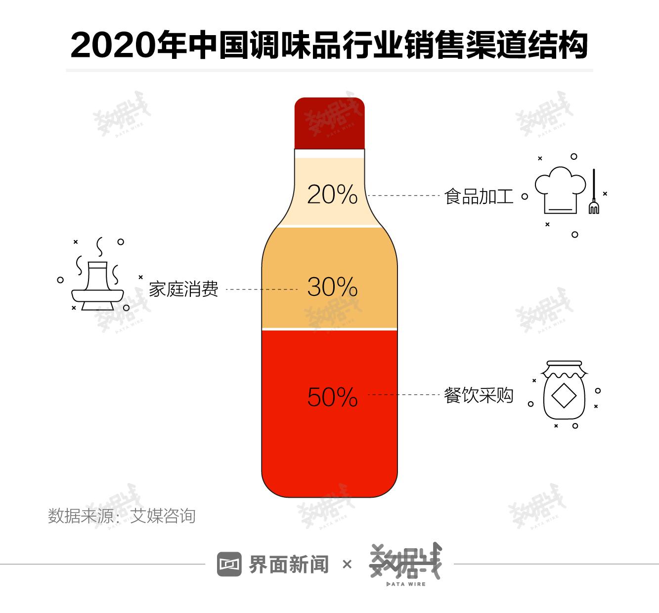 餐馆饭店是调味品的主要买家,普通家庭消费者买得比较少。据艾媒咨询,2020年中国调味品行业一半产品的销售渠道为餐饮业,有3成调味品通过家庭零售渠道销售,另两成销售给食品加工业。