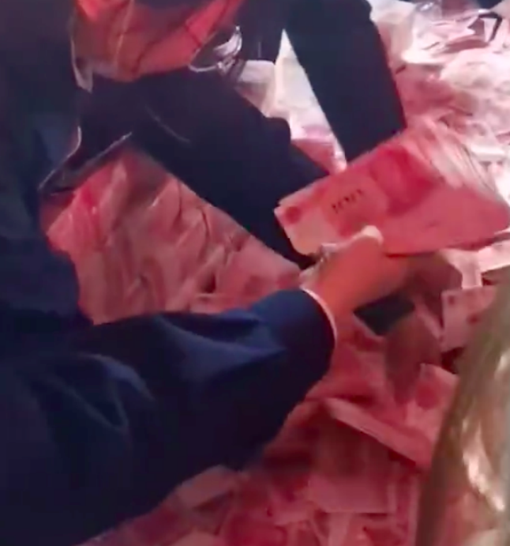 视频中,6100万现金被摆放在舞台上,在两侧堆成“金字塔”形状,员工成捆领取,一名员工手捧现金,没抱好,一捆现金还掉落在地上。对此,网友直呼羡慕。
