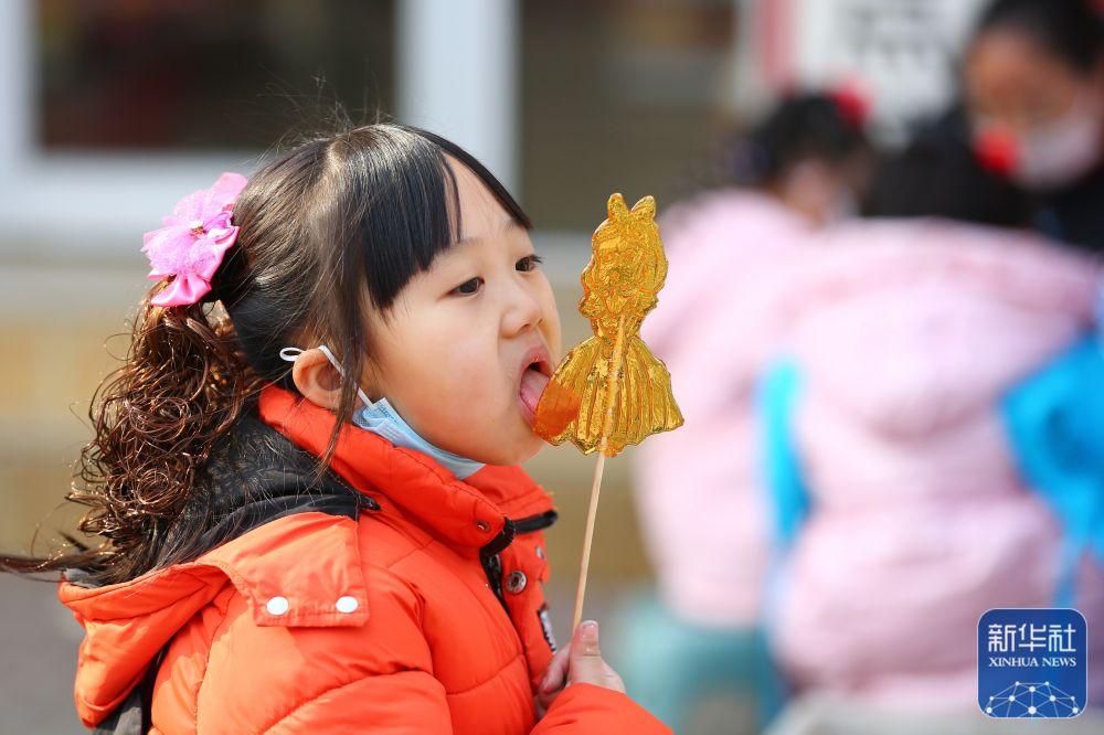 1月22日,一名小女孩在山东省滕州市西岗镇品尝糖画。新华社发(李志军 摄)