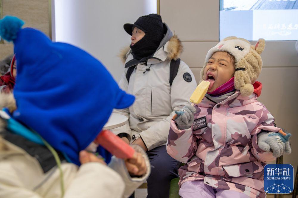 1月24日,在黑龙江哈尔滨市道里区马迭尔冷饮厅,小朋友在吃冰棍。新华社记者 张涛 摄