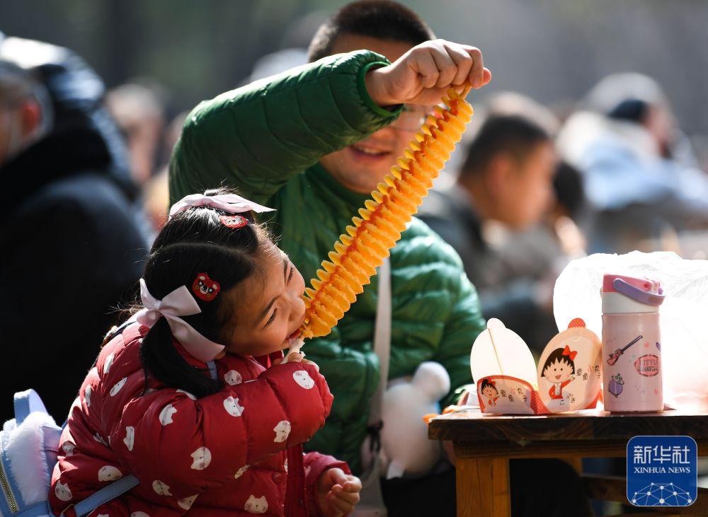1月24日,在山东省临沂市郯城县郯国古城景区美食街,一名小女孩在品尝美食。新华社发(张春雷 摄)