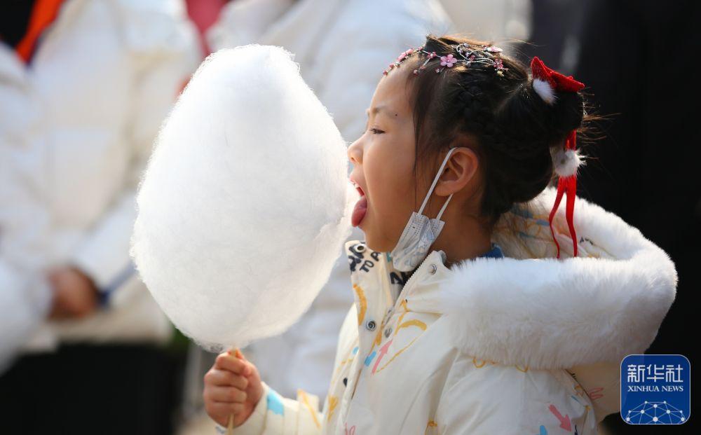 1月22日,在山东省滕州市西岗镇,一名小女孩在品尝棉花糖。新华社发(李志军 摄)