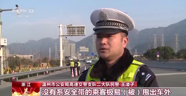 温州市公安局高速交警支队二大队民警 王凌子:车辆在高速行驶当中,如果一旦车辆发生碰撞 侧滑或者是翻车的情况,没有系安全带的乘客极易(被)甩出车外,或者在车里面造成二次碰撞,加大对自己的伤害。我们高速交警提醒大家,在上车的时候一定要系好安全带,无论是前排还是后排,都要使用安全带。